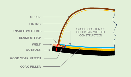 - Upper Stitched to a Leather Welt, then to the Outsole