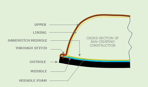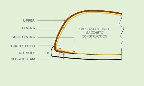 - A soft leather sock (sacchetto) is stitched to the upper inside out