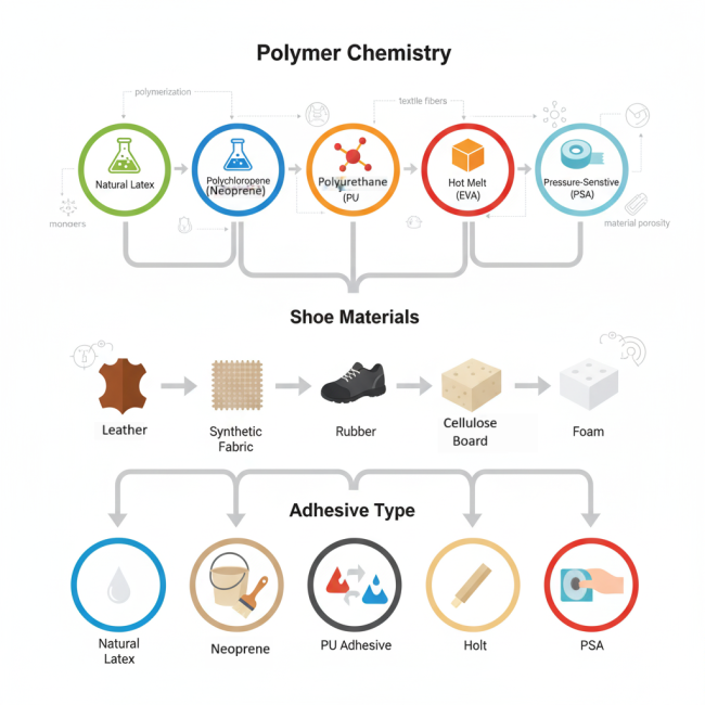 infographic linking polymer chemistry and shoe materials to adhesive types