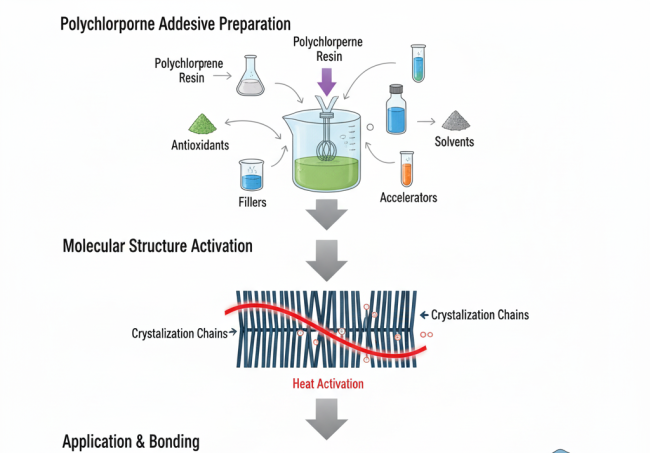 Preparation involves dissolving polychloroprene in solvents, then blending resins and fillers under agitation. The mixture matures for 24 hours to optimize viscosity. For use, apply to surfaces, allow solvent evaporation.