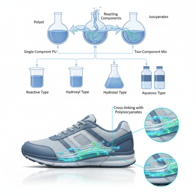 Polyurethane (PU) adhesives dominate high-performance footwear bonding, thanks to their versatility and strength. PU ingredients center on polyols (polyether or polyester) and isocyanates (e.g., MDI 1or TDI2), reacting to form urethane links.