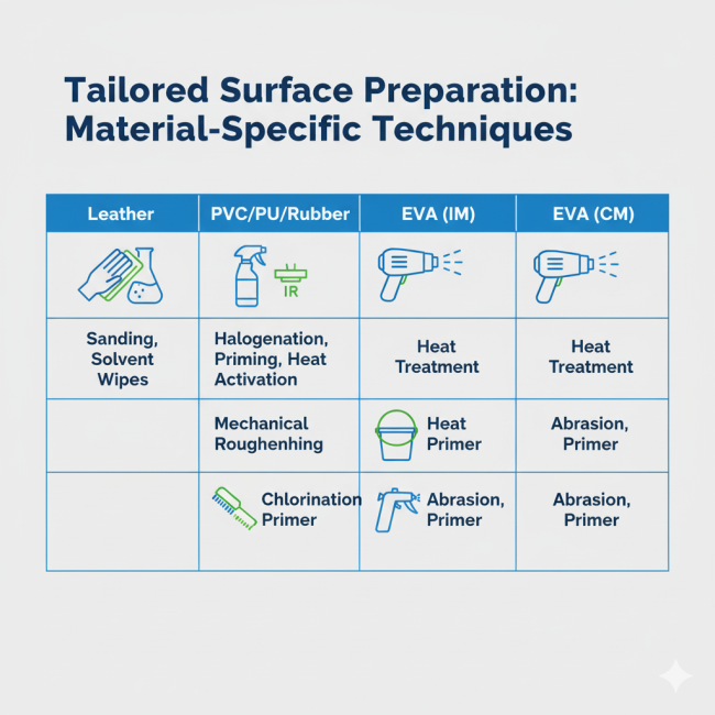Match surface preparation in footwear manufacturing to material traits. See tailored strategies below.